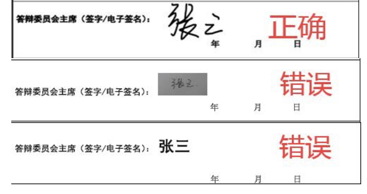 1. 以上材料,所有签名处均需插入电子签名(手写体),包括学生本人、导师、答辩主席、答辩秘书。建议使用png格式的图片。